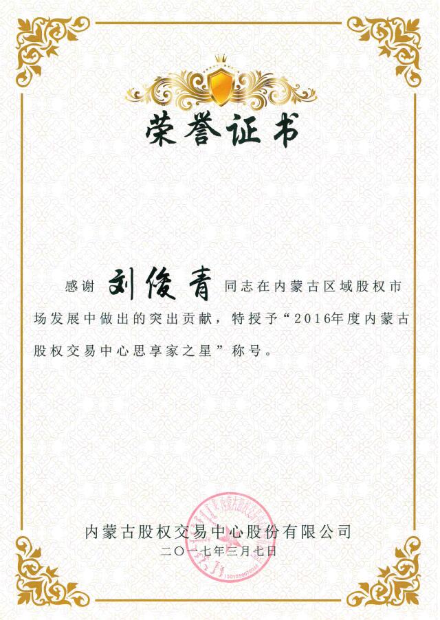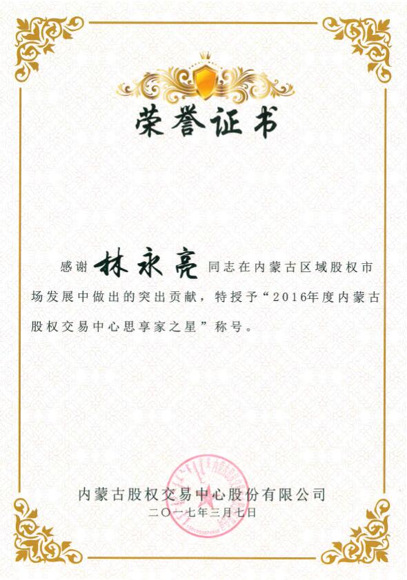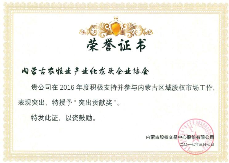 在37日上午召開的首屆內(nèi)蒙古股權(quán)交易中心會(huì)員和分支機(jī)構(gòu)大會(huì)上,內(nèi)蒙古農(nóng)牧業(yè)產(chǎn)業(yè)化龍頭企業(yè)協(xié)會(huì)因積極支持并參與內(nèi)蒙古區(qū)域股權(quán)市場(chǎng)工作,榮獲內(nèi)蒙古股權(quán)交易中心頒發(fā)的“突出貢獻(xiàn)獎(jiǎng)”,協(xié)會(huì)執(zhí)行會(huì)長兼秘書長林永亮及常務(wù)秘書長劉俊青均榮獲“內(nèi)蒙古股權(quán)交易中心思享家之星”稱號(hào)。這是對(duì)協(xié)會(huì)在2016年對(duì)內(nèi)蒙古區(qū)域股權(quán)市場(chǎng)發(fā)展中突出貢獻(xiàn)的肯定,更是承載著一份責(zé)任和希望,新的一年,內(nèi)蒙古農(nóng)牧業(yè)產(chǎn)業(yè)化龍頭企業(yè)協(xié)會(huì)將繼續(xù)秉承“溝通 服務(wù) 自律 發(fā)展”的服務(wù)宗旨,乘勢(shì)而上,加壓奮進(jìn),開拓創(chuàng)新,找準(zhǔn)協(xié)會(huì)工作與股權(quán)經(jīng)濟(jì)建設(shè)的結(jié)合點(diǎn),為推動(dòng)農(nóng)牧業(yè)產(chǎn)業(yè)化發(fā)展做出新的貢獻(xiàn)。