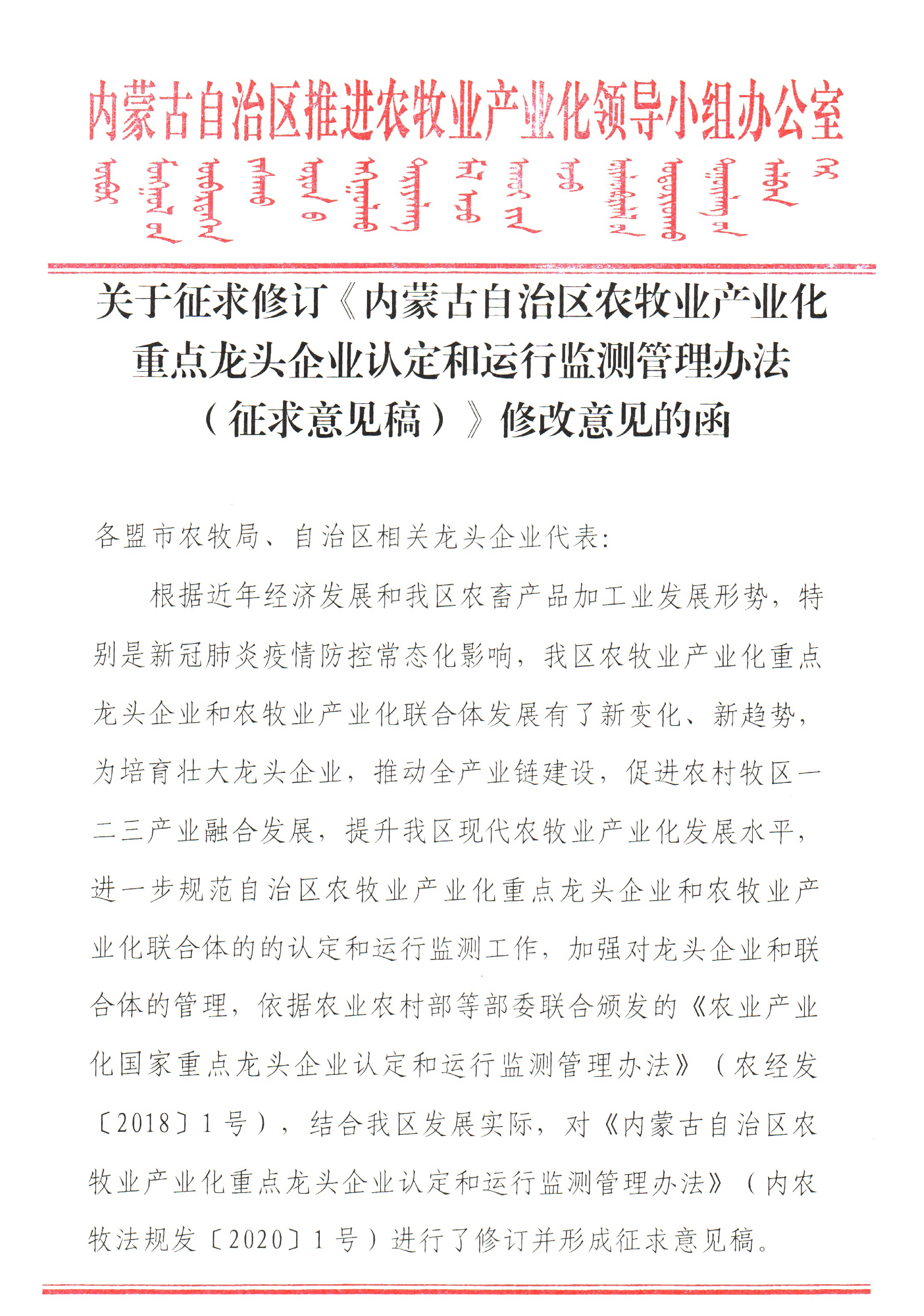 標題:關(guān)于征求修訂《內(nèi)蒙古自治區(qū)農(nóng)牧業(yè)產(chǎn)業(yè)化重點龍頭企業(yè)認定和運行監(jiān)測管理辦法(征求意見稿)》修改意見的函