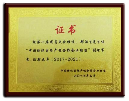 鄭浩生先生任2017-2021“中國紡織國際產(chǎn)能企業(yè)聯(lián)盟”副理事長獎牌