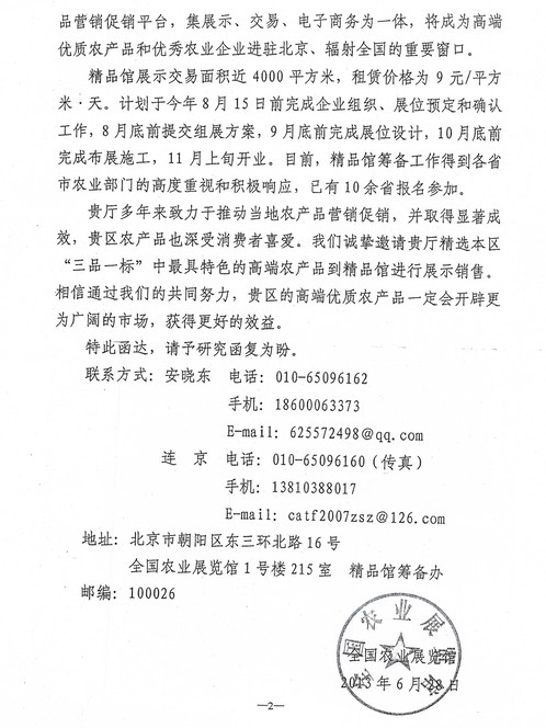 關(guān)于邀請參加全國優(yōu)質(zhì)農(nóng)產(chǎn)品精品館展示銷售的函