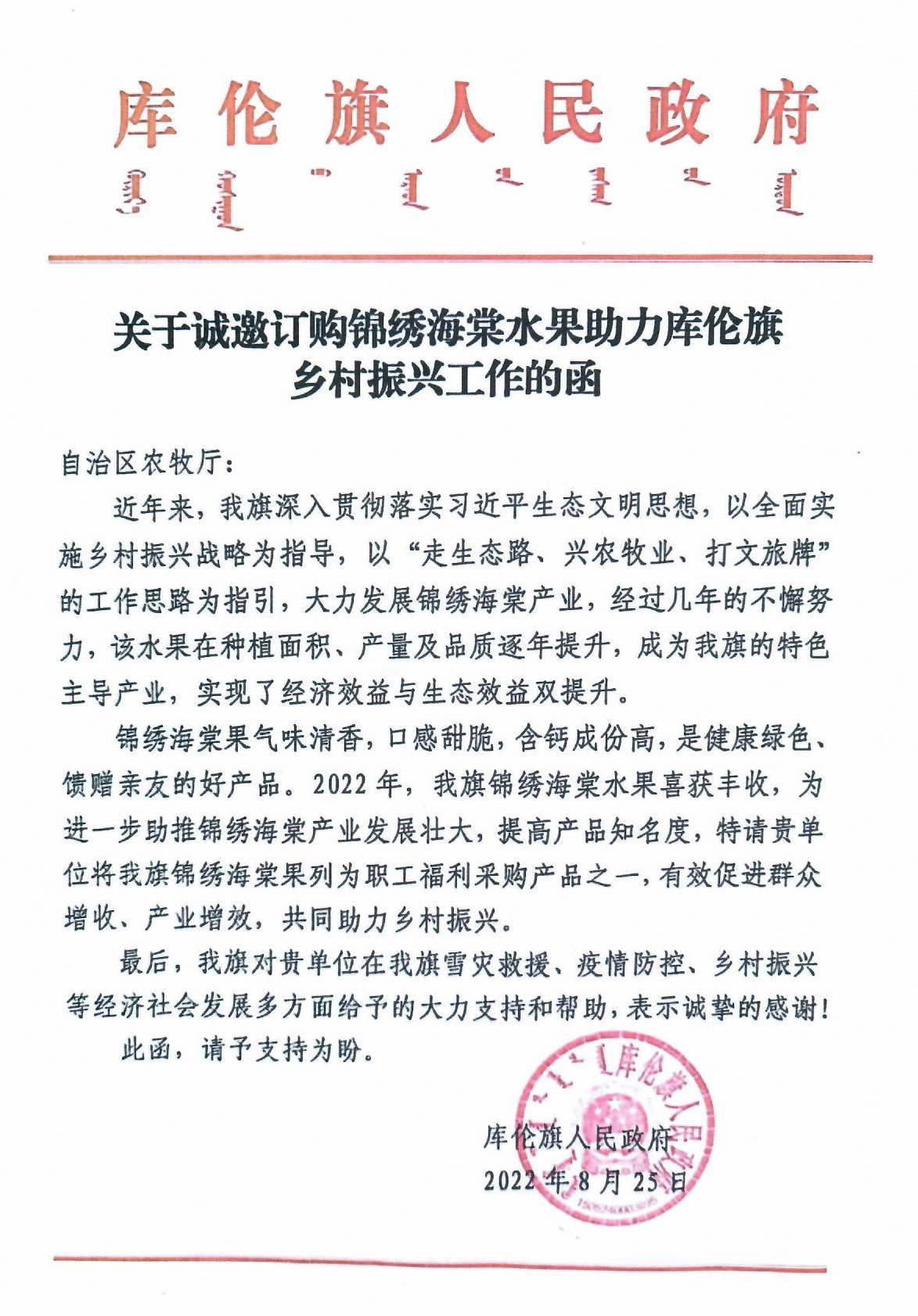轉(zhuǎn)發(fā):關(guān)于誠邀訂購錦繡海棠水果助力庫倫旗鄉(xiāng)村振興工作的函