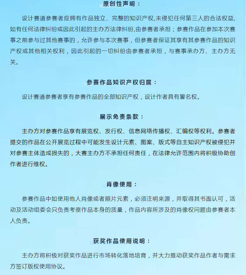 設(shè)計(jì)賽道作品獎(jiǎng)金不包含作品版權(quán),版權(quán)購(gòu)買(mǎi)形式及費(fèi)用由需求單位與獲獎(jiǎng)作者自行協(xié)商確定。