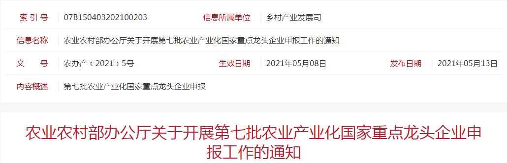 標(biāo)題:農(nóng)業(yè)農(nóng)村部辦公廳關(guān)于開展第七批農(nóng)業(yè)產(chǎn)業(yè)化國家重點(diǎn)龍頭企業(yè)申報工作的通知