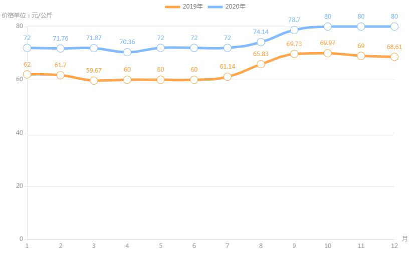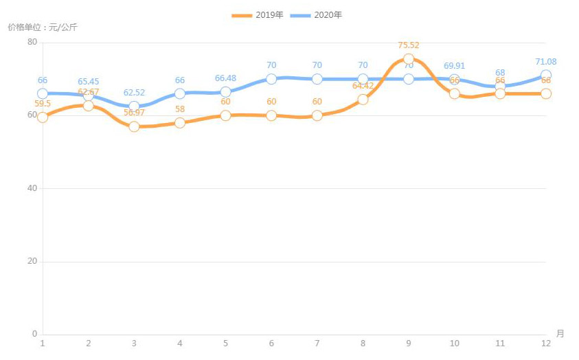 對內(nèi)蒙古幾大農(nóng)貿(mào)批發(fā)市場羊肉價進行匯總分析得出:呼和浩特市內(nèi)蒙古美通農(nóng)產(chǎn)品批發(fā)市場羊肉最高價格出現(xiàn)在2020年11月68元/公斤,最低價格出現(xiàn)在2019年4月52元/公斤。呼和浩特市東瓦窯批發(fā)市場羊肉最高價格出現(xiàn)在2020年12月73.38元/公斤,最低價格出現(xiàn)在2019年5月61.08元/公斤。包頭市友誼蔬菜批發(fā)市場羊肉最高價格出現(xiàn)在2020年12月67.16元/公斤,最低價格出現(xiàn)在2019年3月54元/公斤。內(nèi)蒙古赤峰西城市場羊肉最高價格出現(xiàn)在2019年9月75.52元/公斤,最低價格出現(xiàn)在2019年3月56.97元/公斤。羊肉價格和去年同期相比整體上漲,漲幅基本在每公斤5-15元左右。