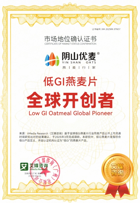 陰山優(yōu)麥此次發(fā)布的新品低GI燕麥片,是其深耕健康食品領(lǐng)域的又一力作。新品不僅通過專業(yè)機(jī)構(gòu)檢測(cè)認(rèn)證,獲得“低GI食品認(rèn)證”,同時(shí)陰山優(yōu)麥還獲得了“低GI燕麥片全球開創(chuàng)者”市場(chǎng)地位確認(rèn)證書。